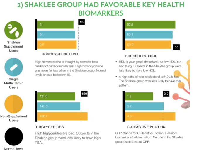 Barkeley School Public Health menunjukkan mereka yang mengambil produk tambahan Shaklee terbukti jelas mempunyai tahap kesihatan yang lebih baik daripada mereka yang mengambil jenama multivitamin yang lain.